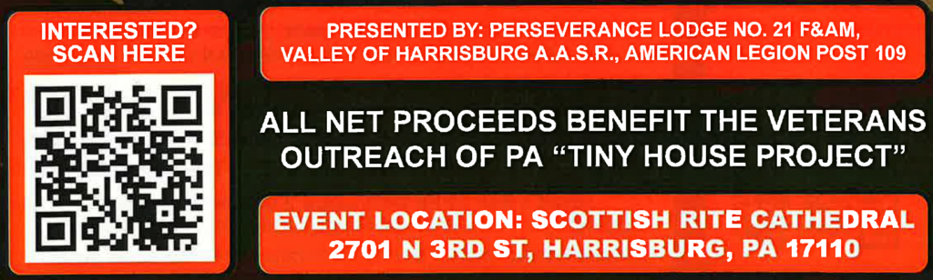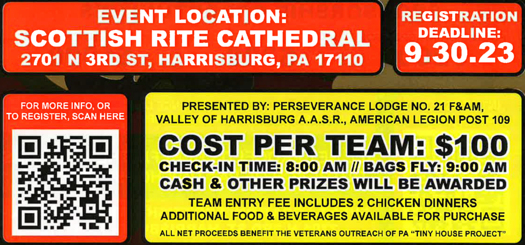 Corn Hole Tournament Click here to download a copy of the pdf. DATE AND TIMES:Saturday October 14, 2023 at 8:00 AMCOST:Prices: Food & Drink Sponsor $200Board Sponsor $300Event Sponsor $1000 (sold)SCOTTISH RITE THEATRE2701 N. 3rd St.Harrisburg, PA 17110(717) 238-2867 X226Free Parking in Well-Lit Lot Adjacent to the Theatr